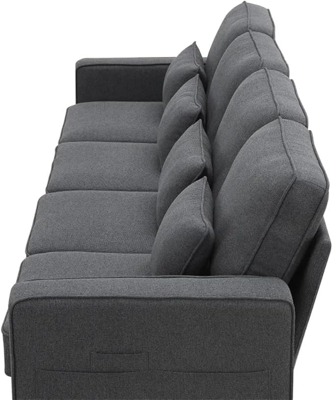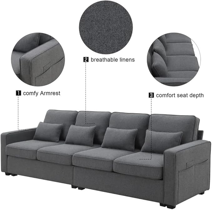 104" 4-Seater Linen Fabric Sofa with Armrest Pockets and 4 Pillows, Couch for Living Room, Apartment