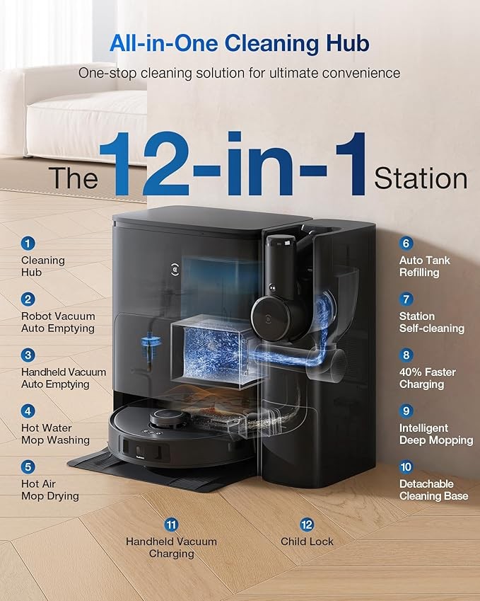 • All-in-One Cleaning Hub - This space-saving design features a bidirectional dust collection system, allowing both vacuums to auto-empty their dustbins into the station's large capacity bag. Plus, it also supports 158℉ hot-water mop washing, hot-air drying and auto water refilling. Ready to tackle any cleaning task, save you time and effort.